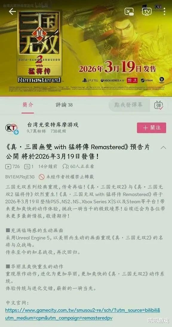 KT宣布,将重制《真·三国无双2:猛将传》,于2026年3月19日登陆PC、PS5、XSX/S、NS2,甚至NS也有份。