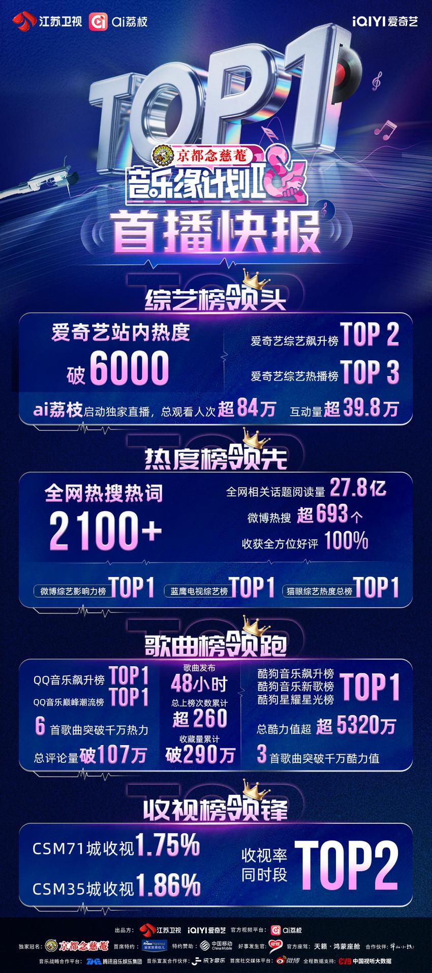 上周五晚,由江苏卫视与爱奇艺联合出品、京都念慈菴独家冠名的全国首档原创全纪实创演节目《音乐缘计划》第二季播出第一期正片。原创音乐人与歌手深度共创,合力为观众奉献了十个兼具创意与情感的首演舞台。果不其然,热搜热榜直接爆了——单期节目共计揽获全网热搜热词2100个,其中微博热搜超693个。