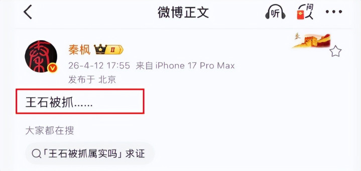 4月12日下午5点55分,一条爆炸性消息在微博上炸开了锅,拥有1400多万粉丝的知名媒体人秦枫突然发了一条简讯:“王石被抓……”这短短几个字,瞬间点燃了网友们的八卦之魂,各种猜测、转发、评论如潮水般涌来。