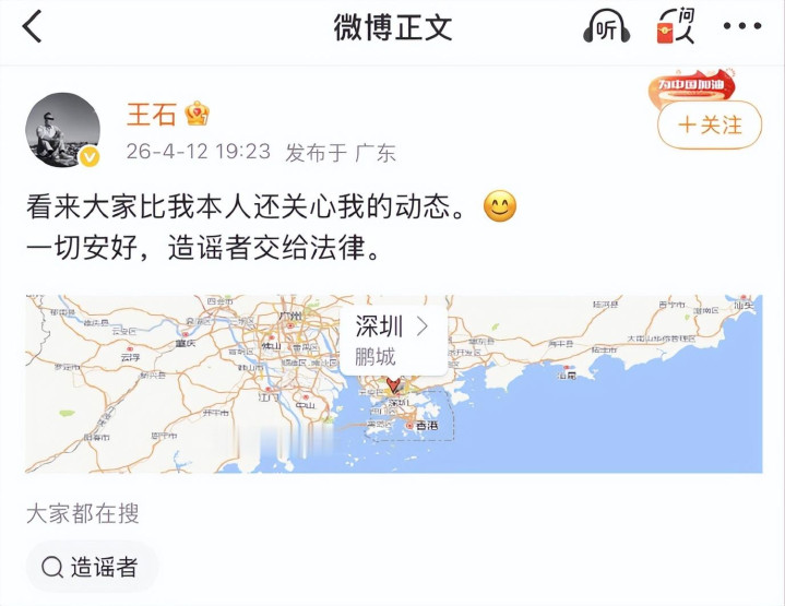 这句话,既幽默又霸气,直接表明了自己的态度:我没事,造谣的人等着法律制裁吧!为了证明自己确实没事,王石还特地附上了深圳的定位,意思是我人还在深圳呢,哪被抓了?