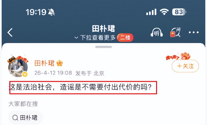 不过,这消息还没热乎多久,王石的妻子田朴珺就坐不住了。晚上,田朴珺在微博上直接回应:“这是法治社会,造谣是不需要付出代价的吗?”这句话,语气强硬,态度明确,直接给谣言泼了一盆冷水。