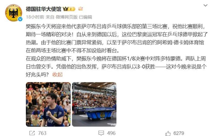 赛前,德国驻华大使馆发文祝樊振东比赛顺利:自从来到德国以后,这位巴黎奥运冠军在乒乓球德甲掀起了热潮。由于他的比赛门票异常紧俏,以至于萨尔布吕肯的约阿希姆·德卡姆体育馆在前两场主场比赛中不得不加设临时看台。