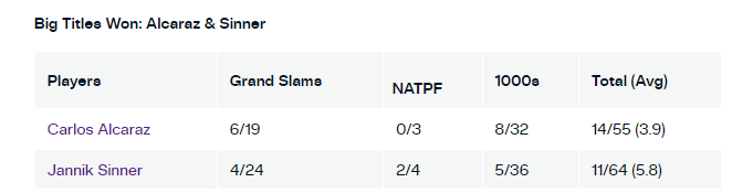 夺冠后,辛纳职业生涯单打冠军总数来到24个,冠军数已经追平了阿尔卡拉斯。其中在重大赛事冠军方面,辛纳目前以11个落后阿尔卡拉斯3个。