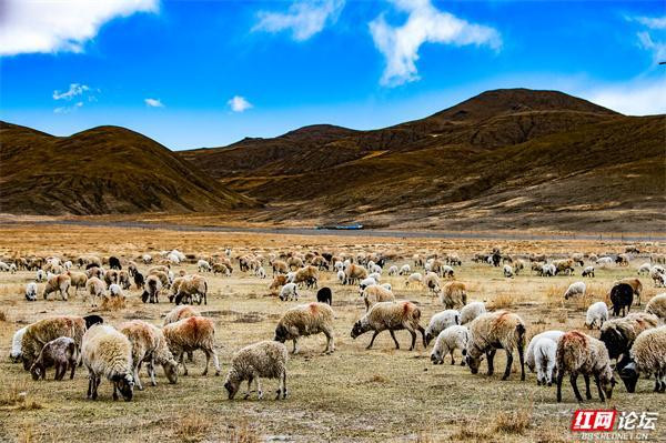 冰上牧场转场,是推瓦村一道壮观的风景。冬季山坡草尽枯死,而普莫雍措湖心有座小岛,却牧草丰茂。每年冬季湖面封冻后,村民就用牛粪灰在冰面撒出一条“防滑路”,赶着排成长长队伍的羊群,浩浩荡荡,穿越蓝冰湖面去小岛过冬。待春回大地,湖面解冻前再把羊群接回。这种世上独有的冰上牧场转场,为这里所独有,延续了上千年。