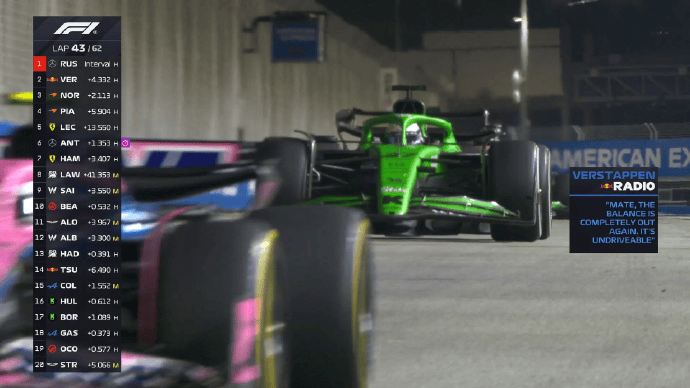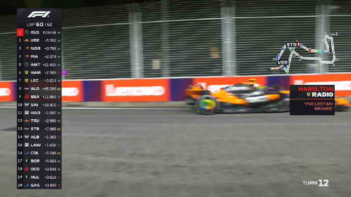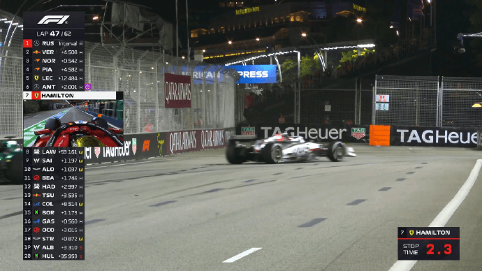 追赶途中维斯塔潘在14号弯锁死,和拉塞尔的差距回到五秒;