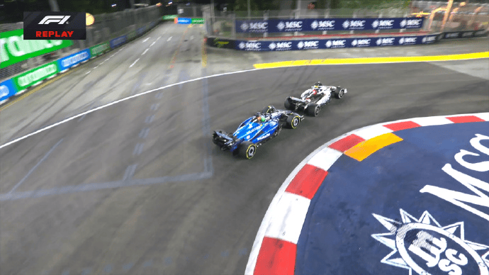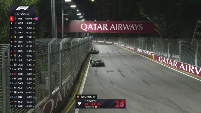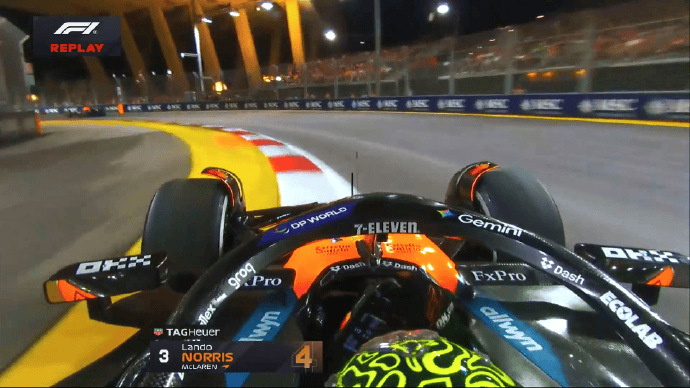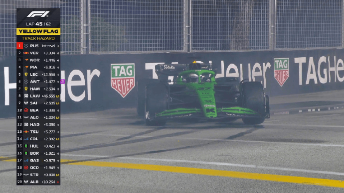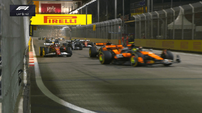 拉塞尔顺利领跑,诺里斯升至P3,但他的前翼端板受损;