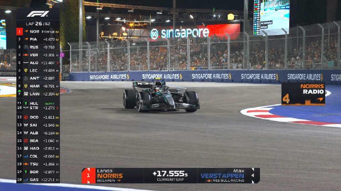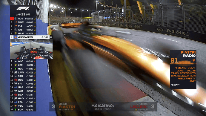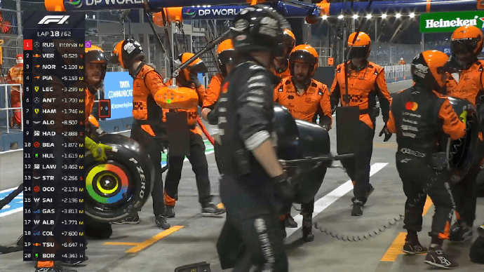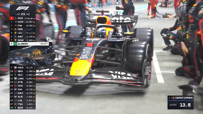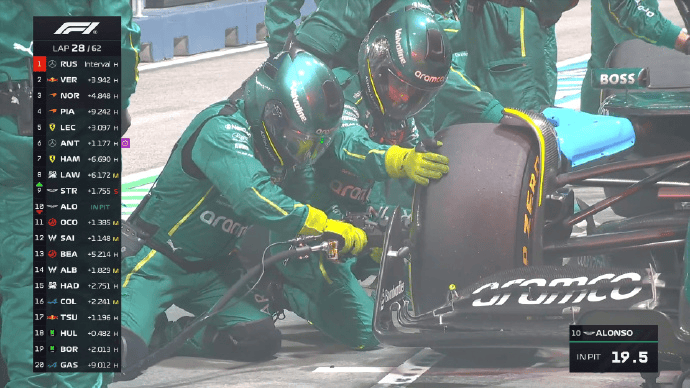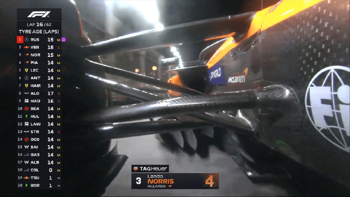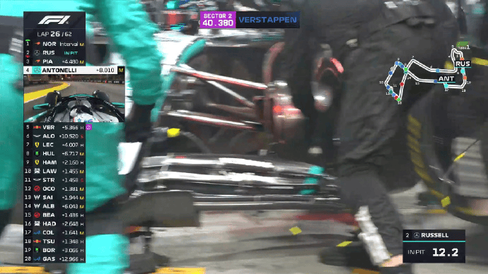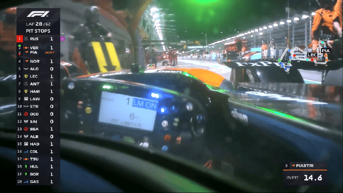 领跑的拉塞尔进站了,他在皮亚斯特里和维斯塔潘之间出站;