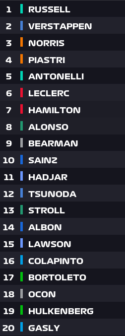 虎扑10月05日讯在刚刚结束的F1新加坡站正赛中,拉塞尔发挥出色,完成PoleToWin,维斯塔潘排名第二,诺里斯凭借优秀起步拿到第三,皮亚斯特里排在第四,安东内利拿到第五,勒克莱尔和汉密尔顿分列六七,排名8-10位的分别是阿隆索、贝尔曼和哈贾尔。另外,迈凯伦在本站过后提前锁定了车队第10座总冠军。